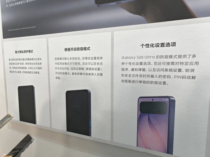 三星Galaxy S26 Ultra在显示层面搭载内置式防窥显示屏 。该防窥屏针对通勤、咖啡馆等日常公共场景而设计,通过软硬件协同工作,在不影响用户观看体验的前提下提供更可靠的隐私防护能力。